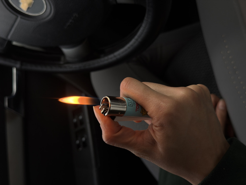 A person holds a lit Clipper lighter inside a car