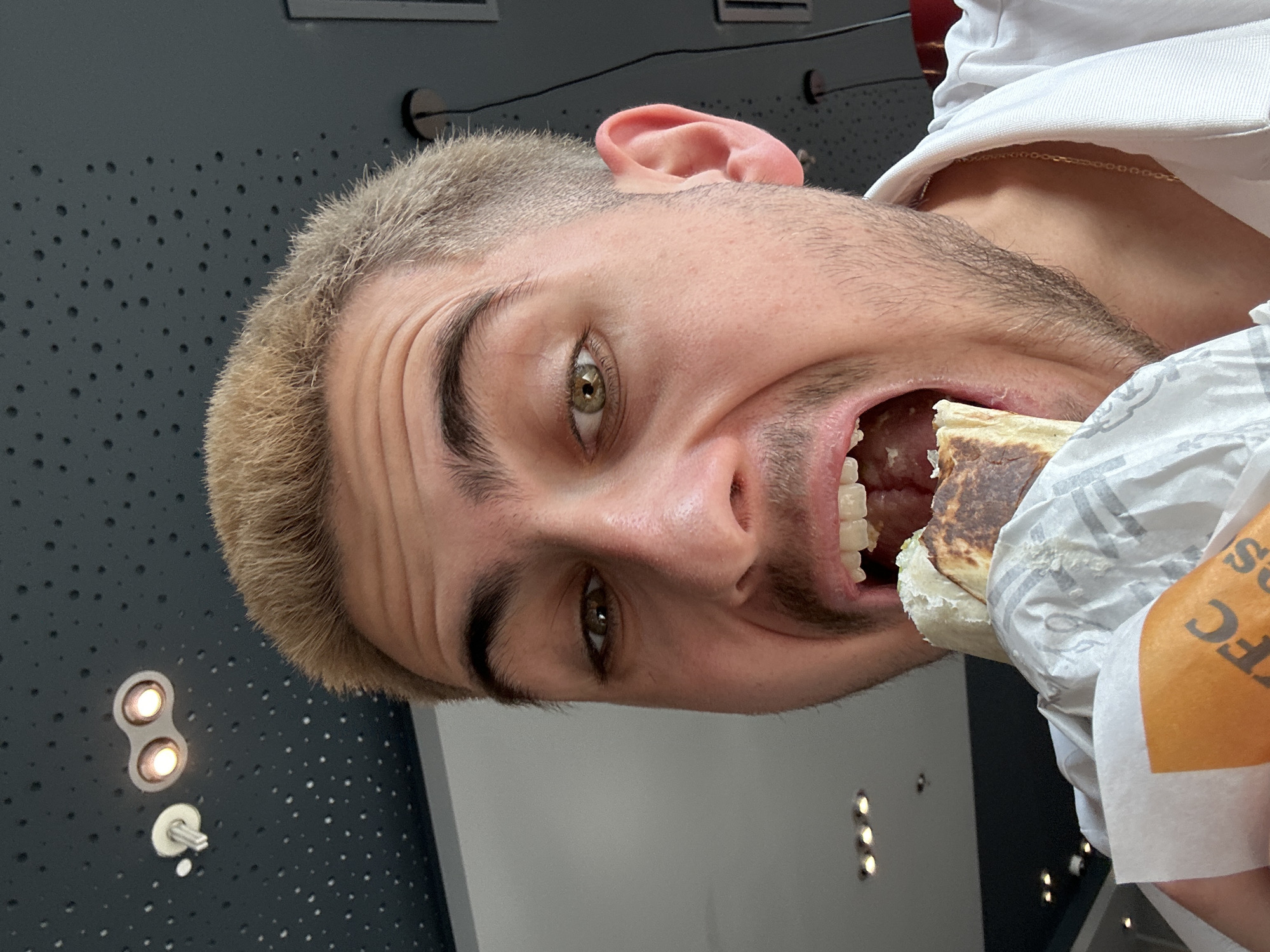 - "A close-up, eye-level selfie captures a light-skinned male, appearing to be a young adult, actively consuming a food item" by FM-BRTx72, licensed under CC BY 4.0