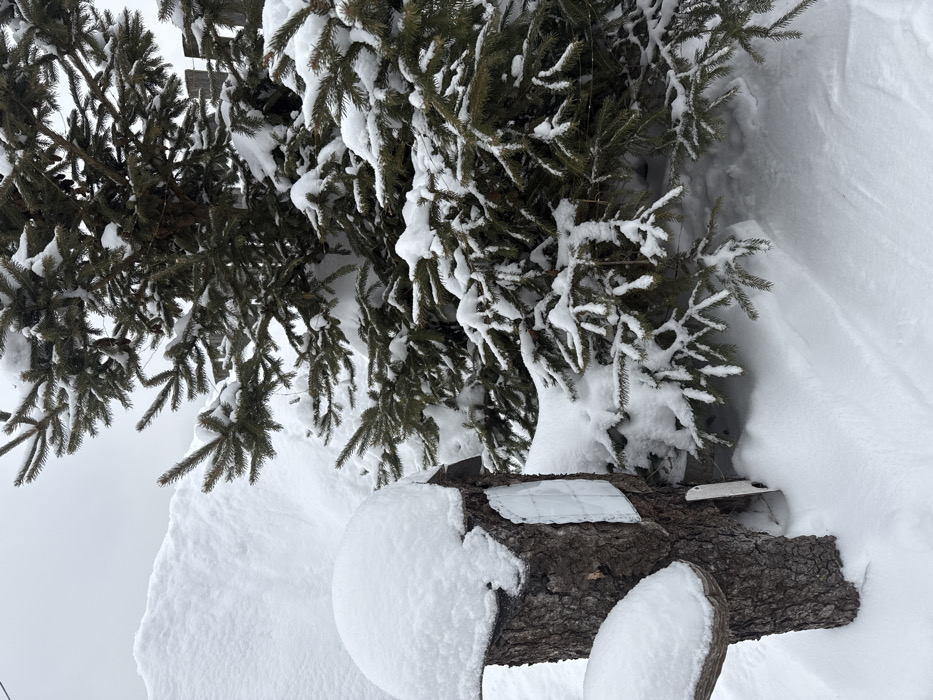 The image depicts a snow-covered outdoor scene in the city of Ольховка, Russia, under an overcast sky. The foreground features a large, dark brown tree stump or wooden post on the left, heavily laden with snow that forms a rounded, dome-like cap on its top surface. A smaller, horizontal wooden element protrudes from the left side of this main post, also capped with snow. A rectangular, white or light-colored plaque or covering is affixed vertically to the side of the main post, partially obscured by snow. Below this plaque, a thin, vertical, light-colored object, possibly a metal marker, extends into the deep snow covering the ground. To the right of the wooden post, a dense evergreen tree, likely a spruce or fir, dominates the midground, its dark green needles heavily frosted and covered with patches of snow. In the background on the left, a substantial snowdrift forms a high, smooth white wall. The entire ground plane is covered with undisturbed, deep white snow. No individuals are present.