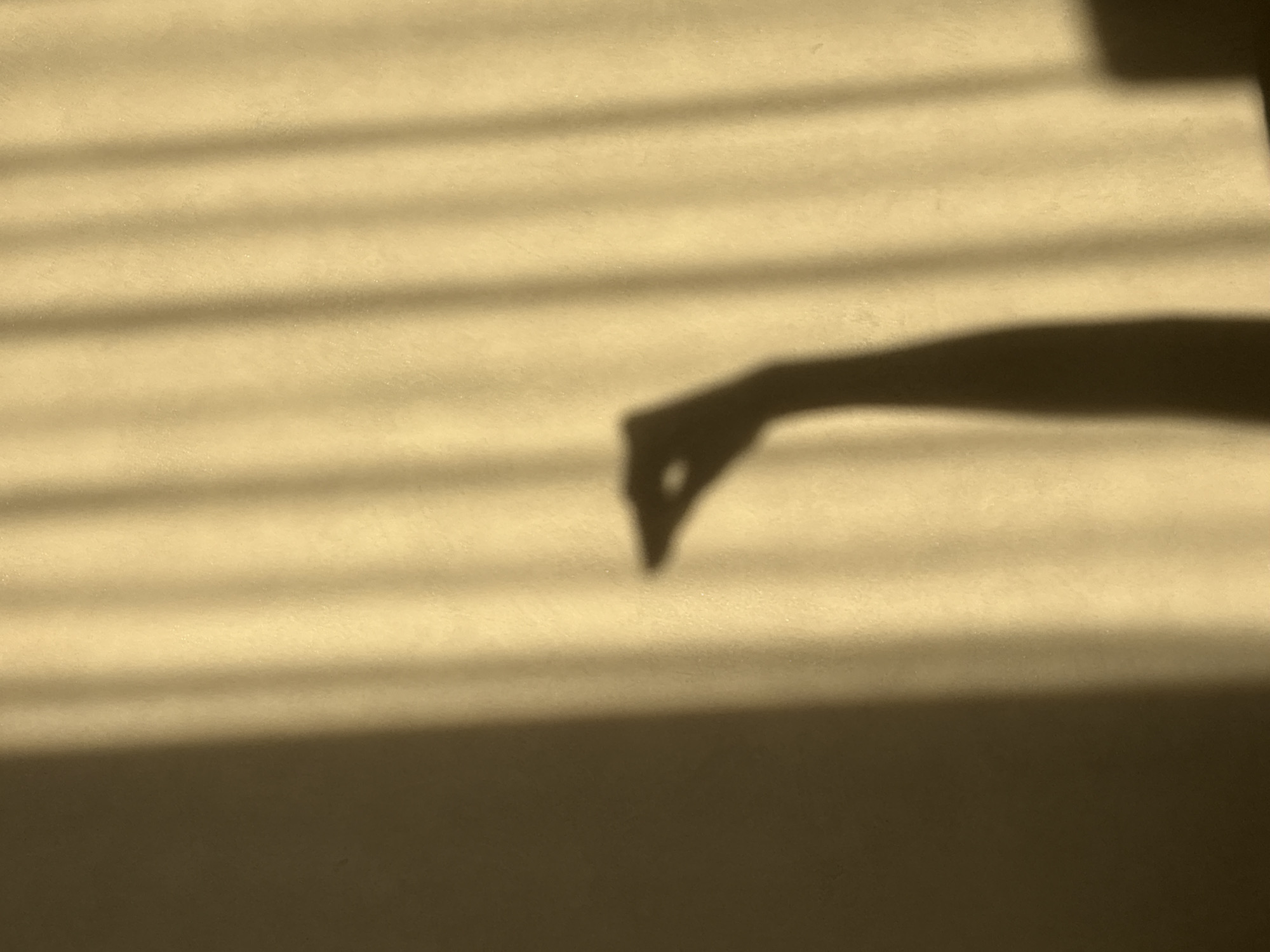 The image displays an interior scene in Kazan, Russia, featuring a light-colored wall illuminated by natural light. Distinct vertical bands of light and shadow traverse the wall, indicative of light filtering through window blinds or vertical slats. The left side of the frame appears darker, transitioning to a brighter, warm yellow-beige tone on the right. A dark, elongated shadow of a human arm and hand is cast against the wall, extending from the lower right and positioning the hand in the central-right portion of the frame. The hand shadow forms a specific gesture, appearing to pinch or hold a small, pointed object between the thumb and forefinger, with other fingers partially obscured or curled. No other subjects or objects are discernible in the scene.