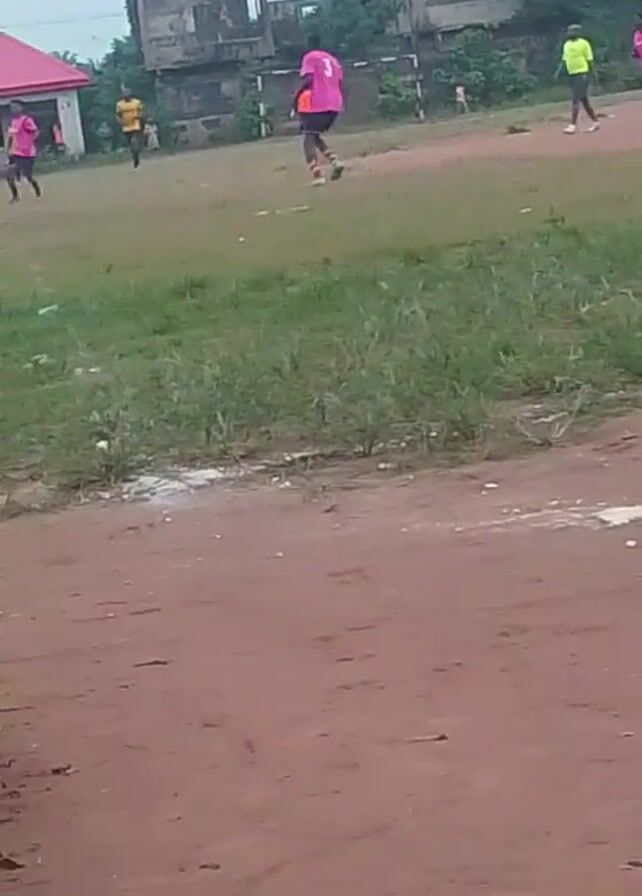 soccer game taking place on a grassy field. Several players wearing yellow jerseys are playing against players wearing pink jerseys. The camera is positioned near a dirt area or path with some vegetation on the side. A small building with a pink roof is visible in the background, as well as a partially constructed or dilapidated building. The sky is overcast and the lighting is somewhat dim. The players are running and kicking a soccer ball. The camera remains stationary throughout the video.