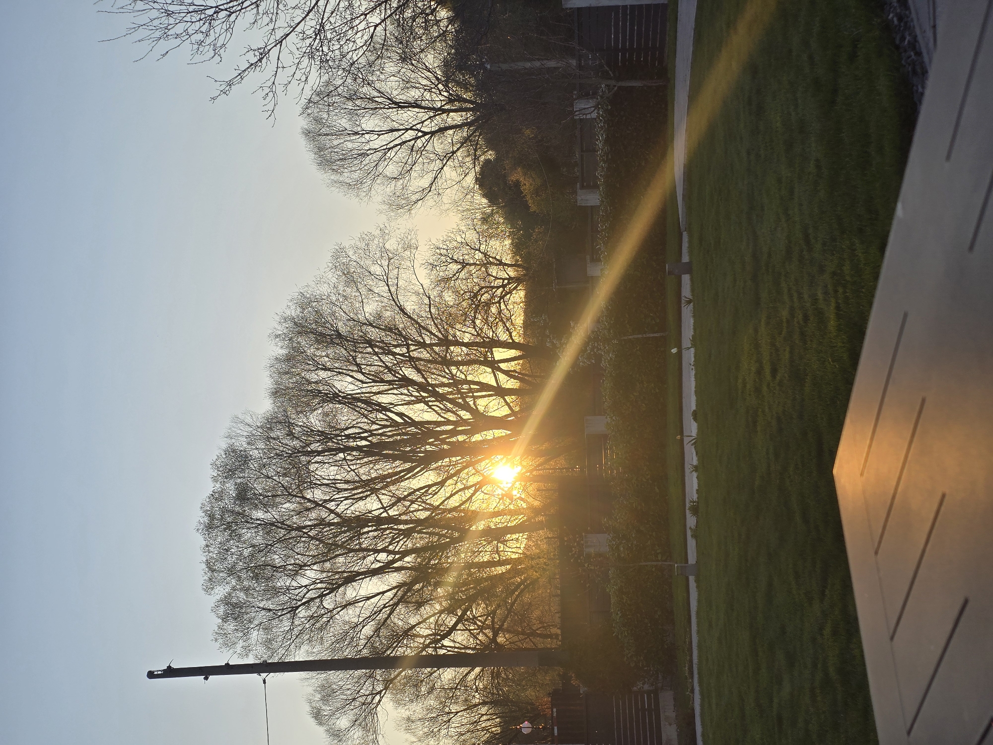 The image depicts a landscape scene in Bankya, Bulgaria, at sunset. The sun, appearing as a bright, central source of light, shines through the bare branches of several trees, creating a starburst effect. The silhouettes of tree branches dominate the lower and central portions of the image, extending upwards. To the right, a green lawn stretches into the distance, adjacent to a building exterior with visible slats. A utility pole stands at the lower-left. The sky is a pale, muted blue.