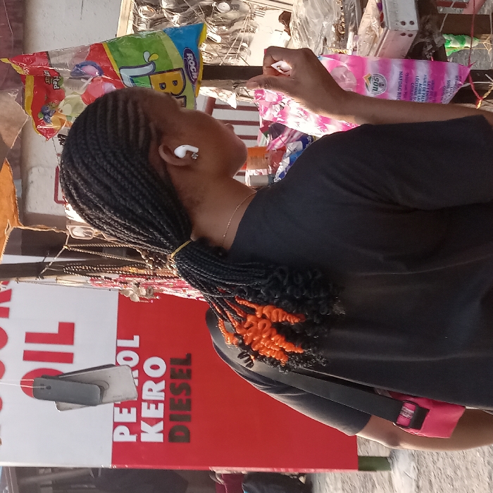 The scene depicts a street or market environment in Umuode, Nigeria. A person, viewed from behind and slightly right, is the central subject. This individual has braided hair pulled back into a ponytail, secured with a yellow elastic band. Sections of the braids, particularly at the lower rear of the head and in the ponytail, incorporate orange-colored hair extensions, while the majority are black. The person wears a black short-sleeved t-shirt and a thin gold-colored necklace. A white earbud is inserted into their right ear. A black strap from a bag extends over the left shoulder, with a segment of a pink bag visible below. The individual's right hand holds a pink-and-white patterned plastic bag, labeled "SON" and containing text in what appears to be a local language and "NAFDAC REG No.", which they are examining. In the background, to the left, a prominent red and white sign reads "OIL" (partially visible), "PETROL," "KERO," and "DIESEL" in bold red lettering, suggesting a fuel sales point. Two dark-colored, flat objects, possibly phone cases, hang by strings in front of this sign. To the right of the person, various items are displayed for sale, consistent with a market stall. These include hanging necklaces or beads, and a colorful plastic bag (yellow, green, blue, red) labeled "BUBBLE," which hangs higher up. Below this, small reflective objects, possibly watches or jewelry, are arranged on a display surface alongside a white container. The lighting indicates daylight.