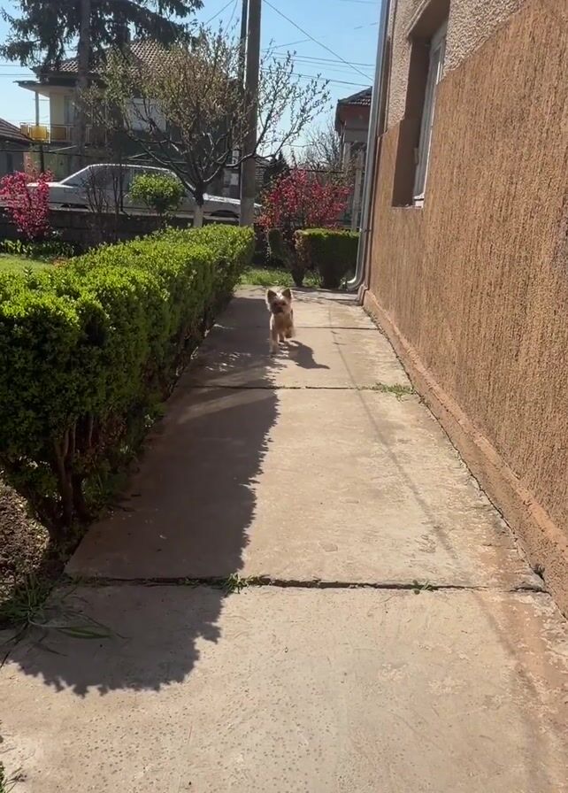 A small Yorkshire Terrier runs on a cement path. The path has grass and greenery on the left, and a tall building with an orange wall on the right. The dog runs towards the camera. A man in white pants is sitting to the right of the path. The dog runs up to the man. He is petting the dog. The day is sunny.