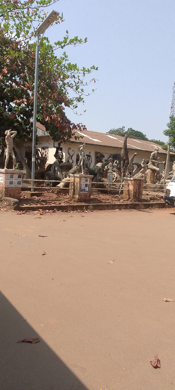 The image depicts an outdoor scene in Nsukka, Nigeria, under a clear, bright blue sky. The foreground features a reddish-brown, unpaved road surface, sparsely scattered with dry leaves. A distinct dark diagonal shadow extends from the lower-left corner across the road. In the midground, a tall, slender grey metallic pole supports a modern solar-powered street light fixture with four visible LED panels. To the left of the pole, a tree with green and reddish-brown foliage partially obscures the background. A low, reddish-brown concrete curb separates the road from a raised earthen area. This raised area functions as an open-air sculpture display, featuring numerous artistic creations. The sculptures vary in material and form, including light-colored humanoid figures, dark abstract metallic forms, and what appears to be carved wood. Notable figures include a light-colored male figure with arms raised overhead, resembling a discus thrower, mounted on a reddish-brown pedestal. This pedestal, along with others, has white posters affixed to its sides. Further right, a figure is depicted kneeling or sitting, and several tall, slender, and intertwined abstract forms are visible. The ground of this display area is reddish-brown earth, also covered with fallen dry leaves. A low railing made of reddish-brown concrete posts connected by horizontal bars with circular decorative elements runs along the edge of the display. In the background, behind the sculpture display, a single-story building with light-colored walls and a weathered, reddish-brown corrugated metal roof is visible. To the far right, a tall metallic telecommunications tower extends upwards, partially visible against the sky. A portion of a white vehicle, specifically its front bumper and part of the windshield, is visible on the far right, positioned near the road and the sculpture display. No human figures are discernible interacting within the scene, only the static sculptures.