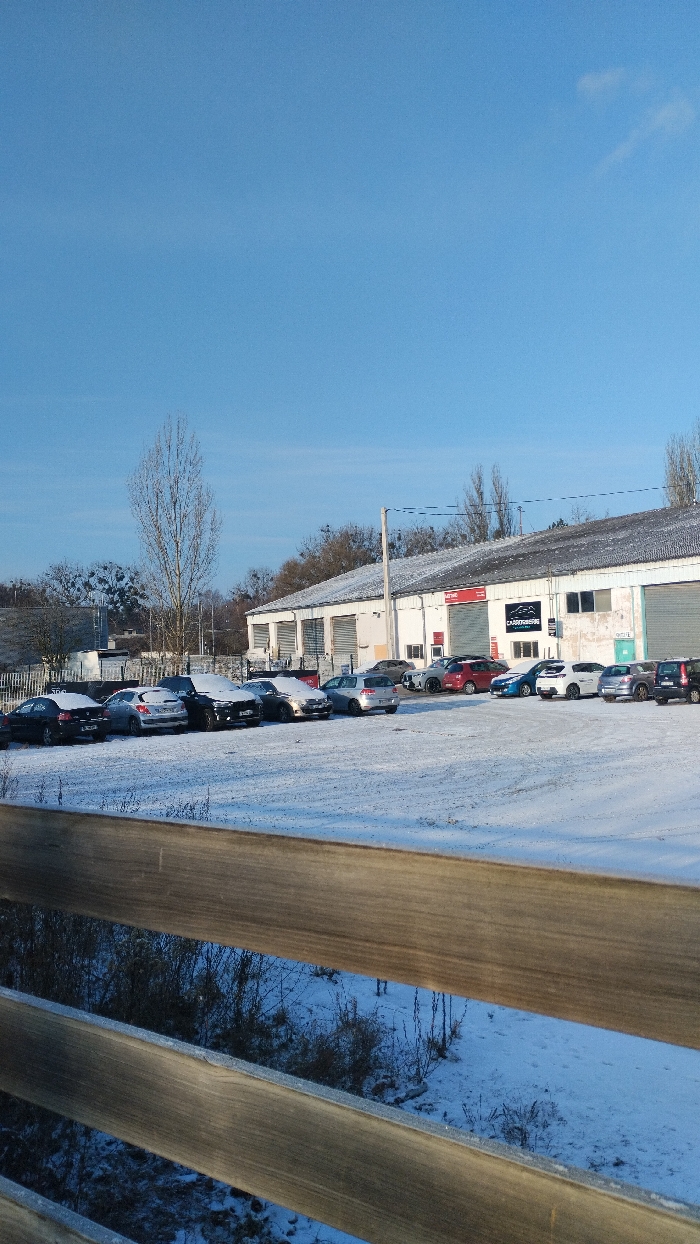 The image depicts a snow-covered commercial area in Hœnheim, France, under a clear blue sky. In the foreground, two horizontal wooden fence planks are visible, partially obscuring snow-covered ground with sparse, bare vegetation. The midground features a snow-dusted parking lot containing approximately 20-30 parked passenger vehicles, including various sedans and hatchbacks. Behind the vehicles stands a long, single-story industrial-style building with a light-colored facade and a dark roof. This building features multiple large roll-up garage doors and smaller windows. Red and black signage is affixed to the facade, with a prominent black sign advertising "CARROSSERIE" (body shop) and "PEINTURE" (paint) alongside a car logo. A utility pole rises near the right side of the building. In the background, a tall, bare deciduous tree is visible to the left, with a line of other bare trees along the horizon. No individuals are present in the scene. The overall environment suggests a cold, clear winter day in an industrial or commercial zone.