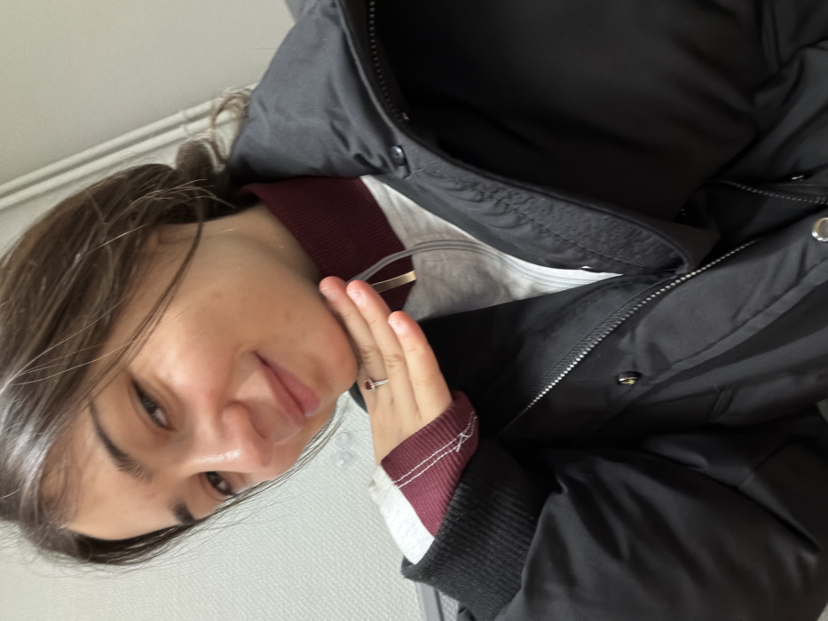 A woman with long brown hair smiles and holds up her left hand, showing off a ring with a red stone. She's wearing a black winter coat over a white top with a maroon collar and cuffs. The coat's zipper is partially open, revealing a silver zipper and snaps. The background appears to be a plain wall, possibly indoors. The image has been rotated counterclockwise.