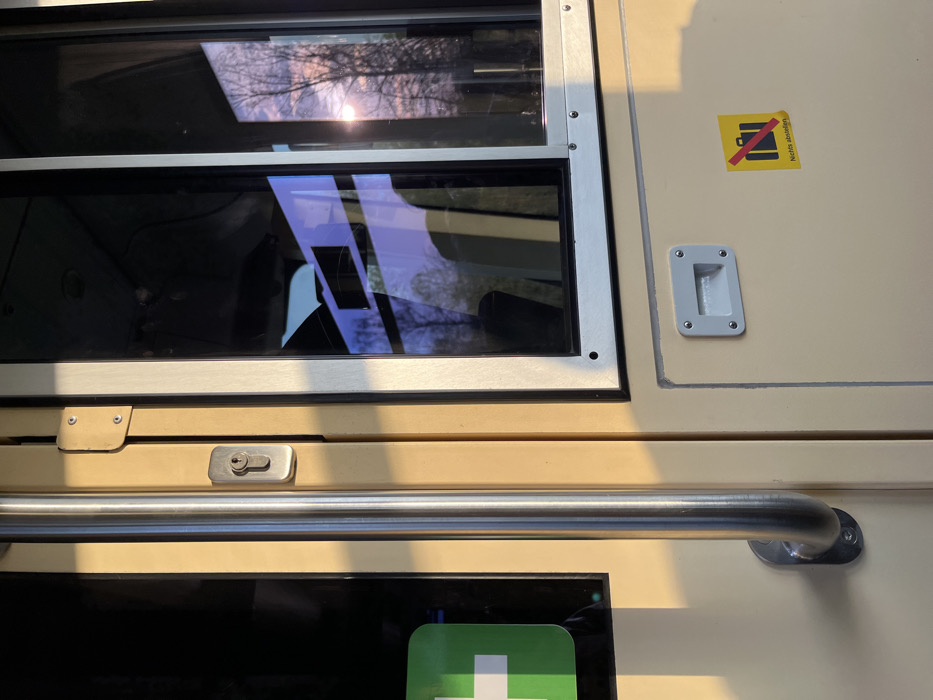 The image displays a close-up, unpeopled scene focusing on the light beige-colored exterior and reflective window surfaces of a public transport vehicle, consistent with the Heidelberg Bergbahn (funicular railway) in Heidelberg, Germany. The scene is illuminated by warm, golden light, suggesting either late afternoon or early morning sun. A prominent vertical, polished silver metal grab handle is securely bolted to a central light beige panel on the left side of the frame. Immediately to the right of this handle, a silver key cylinder lock is embedded within the same beige panel. Further to the right, two vertically aligned windows are framed by light silver-colored metal, secured by visible rivets or screws. These windows reflect an outdoor environment: silhouetted bare tree branches against a sky with distinct pink and orange hues from a low-lying sun, indicative of sunset or sunrise. Darker reflections within the windows reveal portions of the vehicle's interior. On the far left, a portion of a green square with a white cross, a universal first aid symbol, is visible against a dark background, likely another panel or window. In the lower right quadrant of the beige panel, a yellow square sticker is affixed, featuring a black icon of a briefcase or bag crossed out with a red diagonal line, accompanied by the German text "Nichts abstellen." (Do not place/deposit anything). Below the right windows, a light gray, recessed rectangular handle is mounted on the beige panel, secured by four visible screws. The overall impression is a static, functional view of vehicle components.