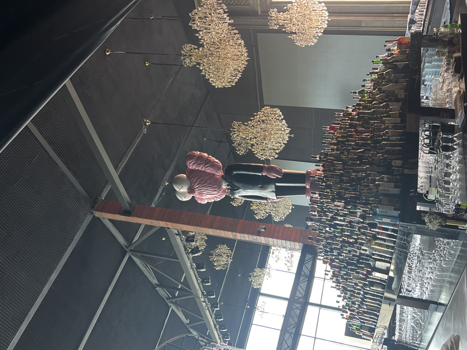 The image depicts the interior of The Kond Restaurant, located in Yerevan, Armenia. A prominent, oversized KAWS Companion art figure, featuring a pink brain-like head with crossed-out eyes and a black suit, stands elevated on a platform. This figure is positioned above an extensive, tiered display comprising hundreds of assorted liquor bottles arranged in ascending rows, forming a wall behind a bar counter. Below the bottle display, a polished bar surface is visible, laden with multiple rows of inverted, empty wine glasses and cocktail glasses. The establishment features a high, dark ceiling with visible structural beams and acoustic paneling. Numerous ornate crystal chandeliers of varying sizes are suspended from the ceiling, providing ambient lighting. Large windows on the left side of the frame allow natural light to illuminate the scene. No individuals are visible in the image.