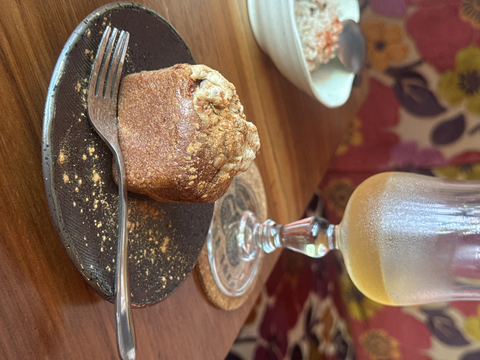This image presents an indoor table setting within an establishment located in Setagaya, Japan. The foreground features a dark, textured round plate holding a single, square-shaped baked good, light brown in color, with a lighter-toned top section generously dusted with reddish-brown powder. A silver-colored fork rests horizontally on the plate, tines pointing left, with additional powder scattered on the plate surface. The table is made of polished wood. To the right, a clear stemmed glass goblet contains a pale amber liquid, exhibiting condensation on its exterior, and rests on a circular cork coaster. To the left, a white bowl, slightly out of focus, contains a light-colored, textured substance topped with red flecks, with a silver spoon partially visible within it. The background displays a vibrant floral pattern on what appears to be upholstery or wallpaper, featuring large motifs in shades of pink, orange, and maroon. No individuals are visible.