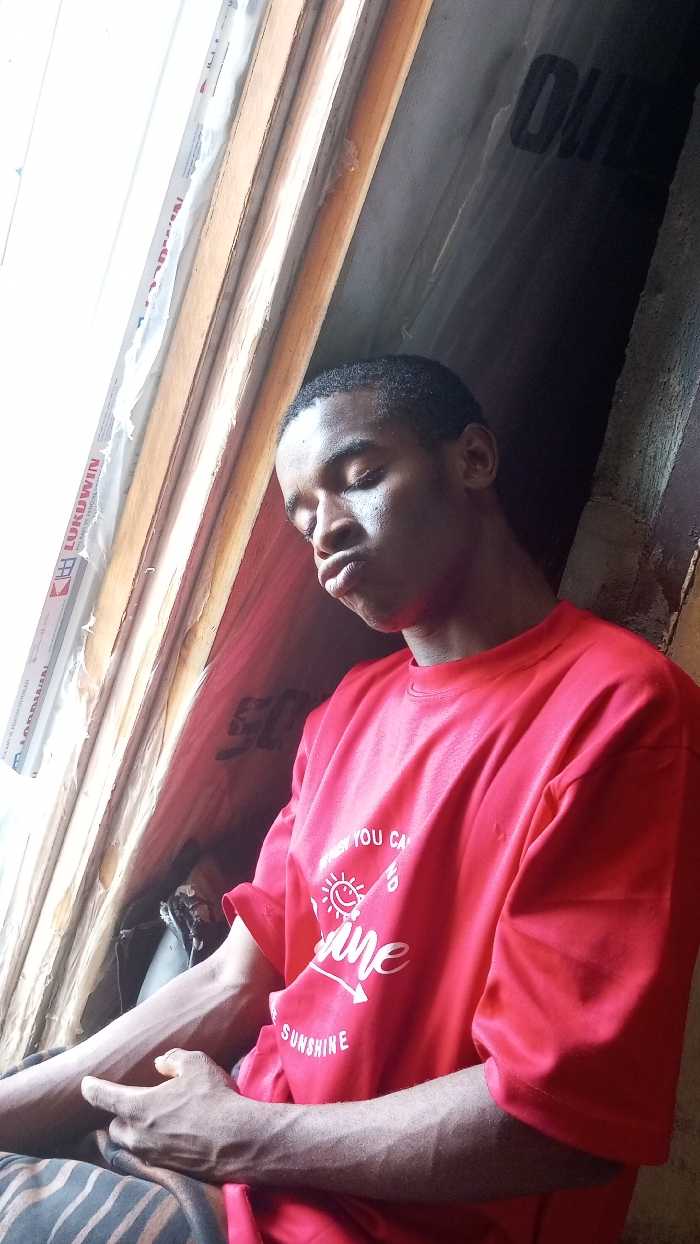 A young male individual is depicted seated indoors in Ogbunike, Nigeria, angled slightly away from a light source originating from the left
