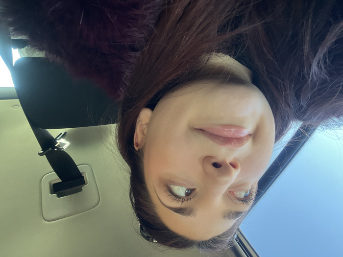 An image taken inside a vehicle in Dorlisheim, France, depicts a young adult female from the chest up, positioned towards the front passenger side