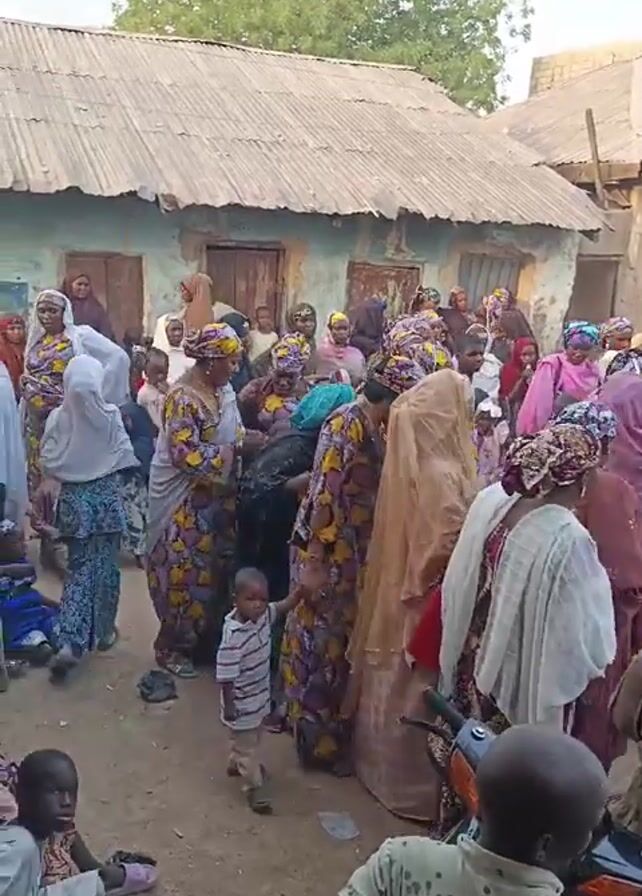 A large crowd of people is gathered outside in a rural setting. Many of the women are wearing colorful patterned outfits with head wraps. Some of the men are in traditional Islamic clothing, including white caps. Children are scattered among the adults. The background shows buildings with corrugated metal roofs and walls in need of repair. People are talking and interacting with each other in a social setting.