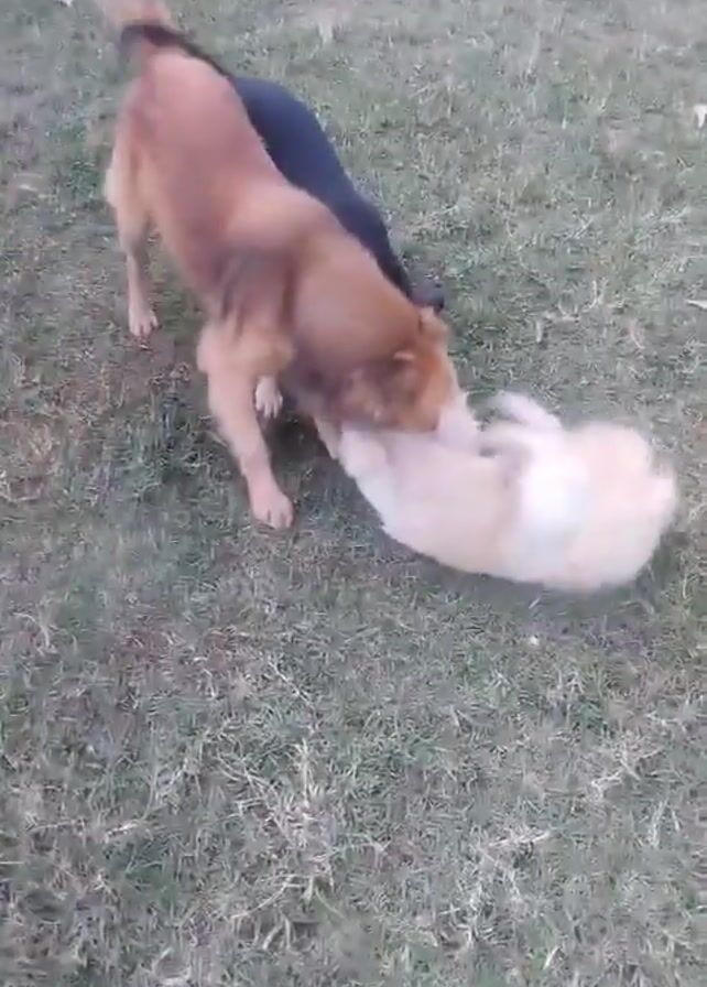 - "Two dogs, one brown and one black, are seen playing on a grassy lawn with a smaller, white dog" by FM-ceYJN2, licensed under CC BY 4.0