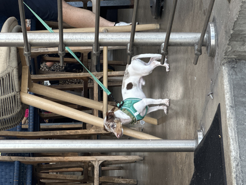The image displays a small, short-haired dog, likely a terrier or chihuahua mix, with white fur and brown/merle patches on its head, back, and ears. The dog wears a teal-green mesh harness with a visible heart-shaped tag, possibly engraved "REMY," and is attached to a matching teal-green leash that extends towards the right. It stands on a light-grey concrete floor, facing left, within what appears to be an outdoor or semi-outdoor dining area of a casual establishment. In the background, numerous wooden bar stools with wicker seats and blue accents are visible, occupied by indistinct patrons. A person's bare leg, wearing dark shorts and a light-colored shoe, is partially visible on the right, adjacent to the leash's direction. The immediate foreground features a vertical silver metal pole on the left and a horizontal silver metal railing structure on the right. A black mat and a small metal object resembling a screw are present on a slightly raised concrete surface in the lower-left. The setting is consistent with a restaurant or bar patio in the city of Miami, United States, though the precise address or venue name is not discernible from the image.