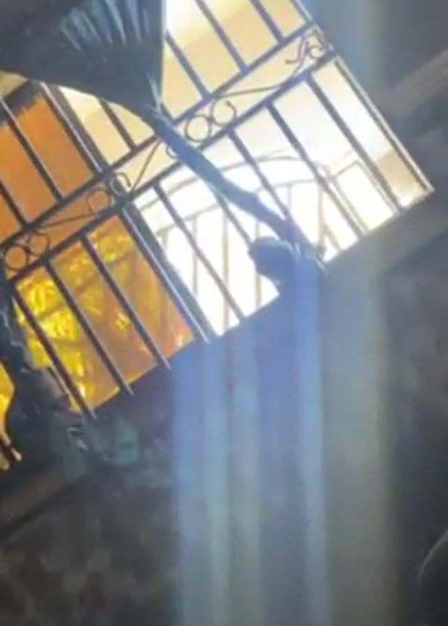 room interior from a low angle, focusing on a window with a metal grill. Sunlight streams intensely through the window, creating bright glare. A partial curtain hangs to the left. A dark shape, possibly a person, is seen outside the window, reaching through the grill. The walls appear to have patterned wallpaper. A dark couch and a fan are partially visible in the foreground.
