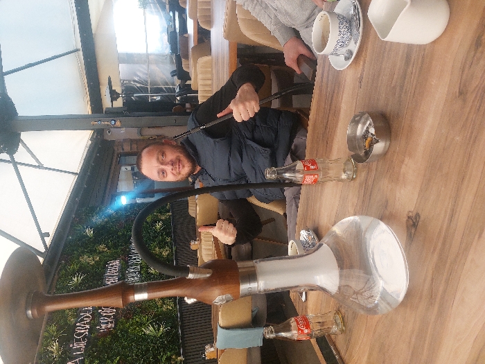 The image captures an outdoor or semi-outdoor seating area of a shisha lounge or cafe in Wiesbaden, Germany. A fair-skinned man, with short brown hair and a beard, wearing a dark blue vest over a dark long-sleeved shirt, is seated at a light-colored wooden table. He is smiling directly at the camera and giving a thumbs-up with both hands, holding a black shisha hose in his right hand. A second individual's right arm and leg, clad in light grey trousers, are partially visible on the right side of the frame, also seated at the table. In the foreground, a shisha pipe with a wooden stem, metallic accents, and a clear glass base filled with water stands on the wooden table. Two empty clear glass Coca-Cola bottles are present on the table, one partially obscured behind the shisha and another to its right. A round, silver-colored metal ashtray containing cigarette butts and ash is situated between the shisha and a white cup with a blue patterned saucer, which holds a light brown liquid. A small white pitcher is positioned to the right of the cup. The background features a vertical garden wall with white text on the left. Further back, additional tables with light-colored upholstered chairs are visible. A white canopy covers the seating area, and an outdoor heater is present on the right side of the frame. A distinct blue light emanates from an object located behind the shisha pipe.
