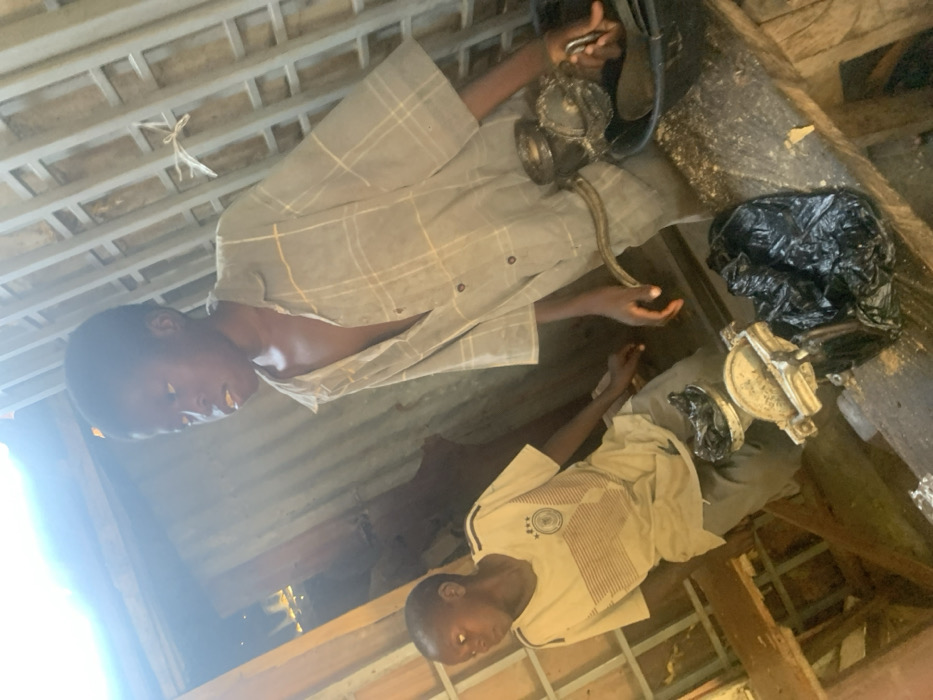 The scene depicts two young males inside an utilitarian structure in Dabawa, Nigeria