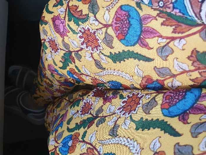 A close-up, high-angle view captures the lower body of an individual seated in an interior space in New Town, India. The subject's legs are covered by golden-yellow pants featuring a detailed, multi-colored floral and foliage pattern. The pattern includes prominent stylized flowers and leaves in shades of blue, reddish-orange, purple, various greens, and light grey. Dark sandals with lighter-colored straps or soles are visible on the feet, positioned against a uniformly dark, featureless background, indicating an enclosed environment. The perspective is from above, looking down towards the seated person's lap and lower legs.