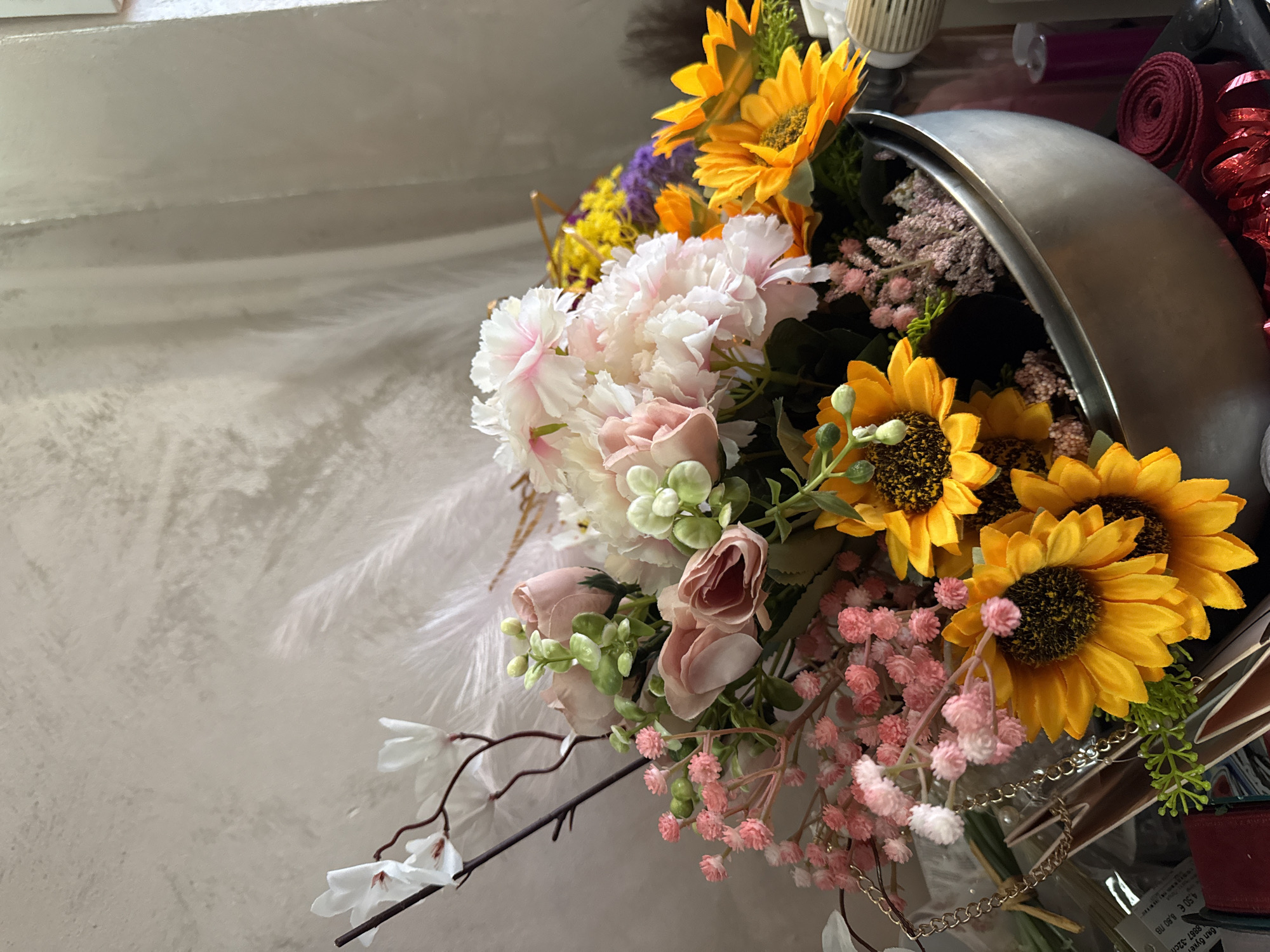 The image depicts a floral arrangement in Sofia, Bulgaria. The arrangement features sunflowers, pink and white flowers, feathers, and pink baby's breath, contained in a metallic container. In the background, there is a rolled-up red ribbon. The setting appears to be indoors with a textured gray surface on the left.