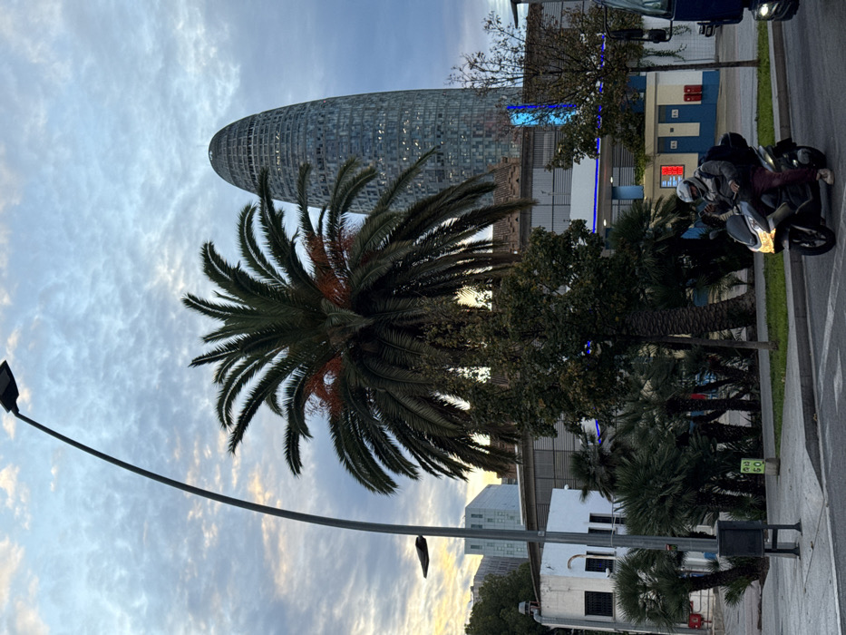 A sideways view reveals a city scene. A tall, cylindrical building dominates the background, partially obscured by a palm tree. A street light rises from the bottom left. A motorcycle with two riders passes on the right. Various buildings, trees, and signs fill the space between the motorcycle and the tall building. The sky above is cloudy.