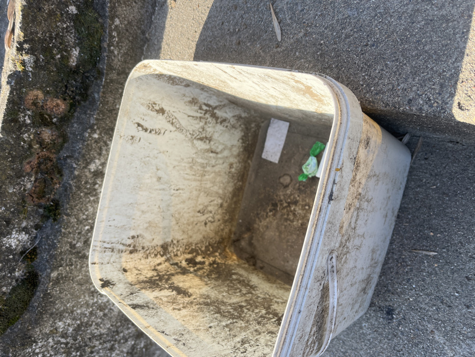 - "A dirty, light-colored, rectangular plastic bucket is positioned on a concrete surface in Cherven Bryag, Bulgaria" by FM-l8nsv2, licensed under CC BY 4.0