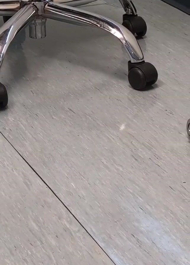 base of a chrome office chair with black wheels on a gray tiled floor. A small, chrome object sits on the floor to the right of the chair. The bottom of a dark wall runs along the top of the frame.