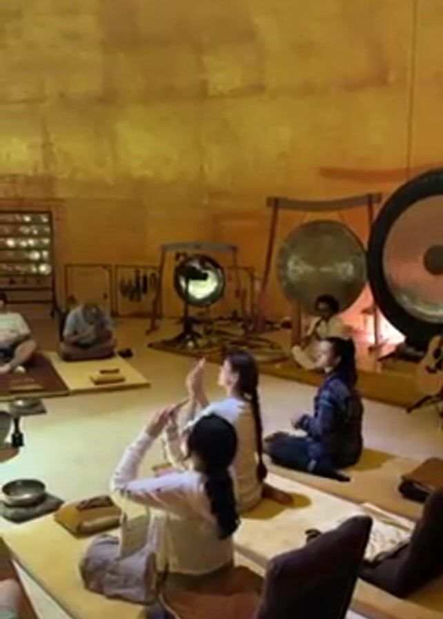 group of people sitting on mats in a circular room with warm-toned walls. The room appears to be set up for a sound healing session, with various gongs and singing bowls arranged around the space. A person is playing a flute. Several people are looking at their phones, while others seem to be meditating or observing the scene. The room has a relaxed and serene atmosphere. There is a guitar leaning against the wall as well.