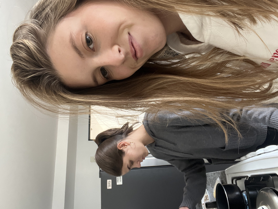 Two women are in a kitchen. One is looking directly into the camera and is wearing a white sweater. She has long brown hair. The other woman is standing in front of the stove, presumably cooking. She is wearing a grey sweater and has her brown hair in a ponytail with bangs. There is a black refrigerator and stove behind her.