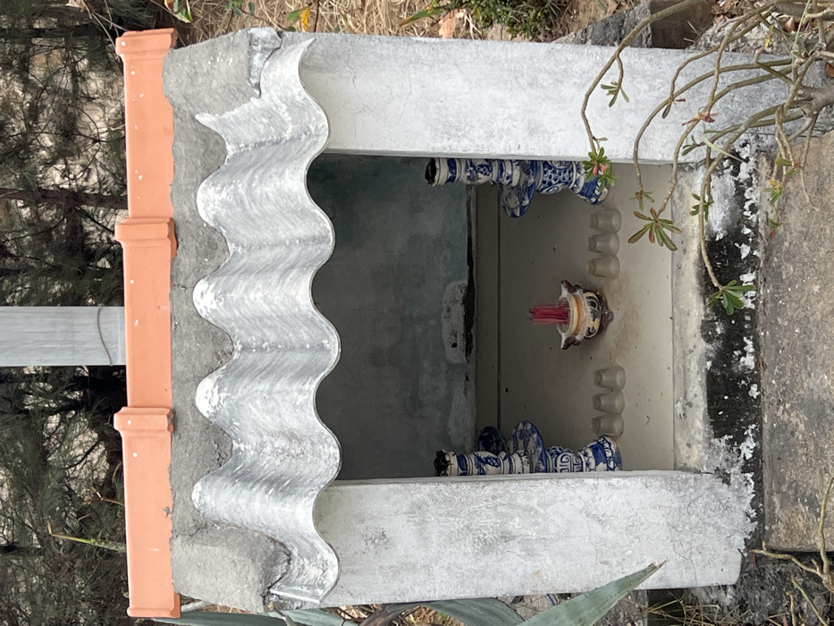 A small, concrete roadside shrine features a corrugated, wavy concrete roof. Its base is a concrete shelf housing blue and white porcelain objects. A central ceramic incense holder contains red incense sticks. The shrine's exterior is weathered with visible stains and is situated among foliage and trees. The structure combines raw concrete with decorative elements, reflecting a blend of practicality and spiritual reverence.