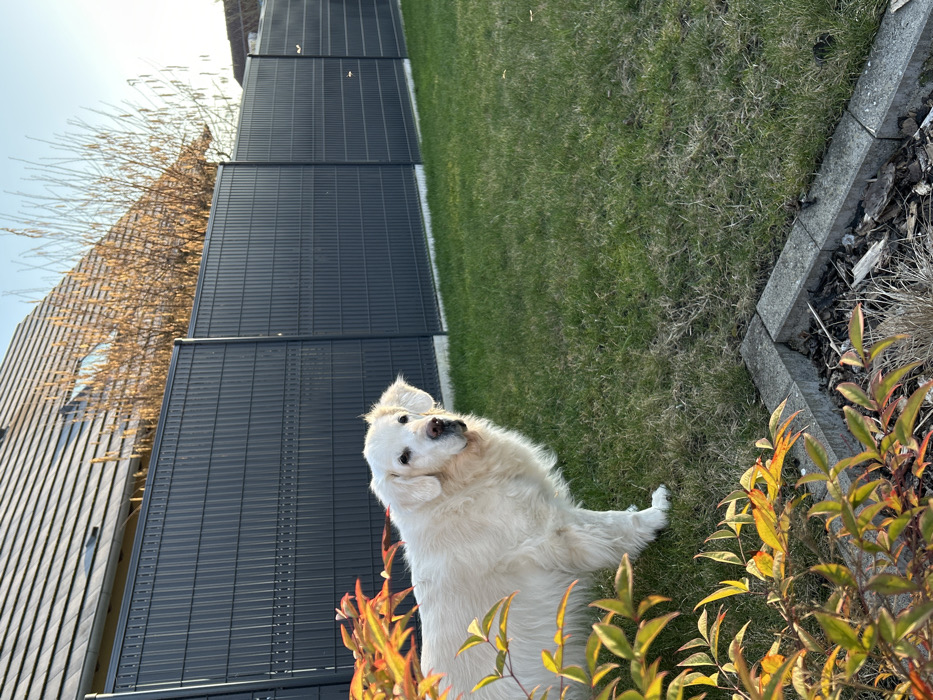 An outdoor scene in Truchtersheim, France, depicts a large, light-cream colored dog, consistent with a Golden Retriever, standing on a verdant lawn. The dog is positioned slightly left of the frame's center, facing the camera with its head turned, its ears partially perked. Its left side is partially obscured by the foliage of a foreground plant displaying green and reddish-orange leaves, situated within a concrete-edged garden bed containing mulch. Directly behind the dog and extending across the midground is a uniformly green, cut grass lawn. The background features a tall, dark grey privacy fence constructed of horizontal slats and vertical posts, extending from left to right across the image. Above the fence, the tiled roof of a residential structure, possibly dark grey or black, is visible, along with a dormer window. Bare deciduous trees or shrubs with thin, light brown branches and small buds are visible between the fence and the structure. The sky is clear and light blue, indicating daylight conditions.