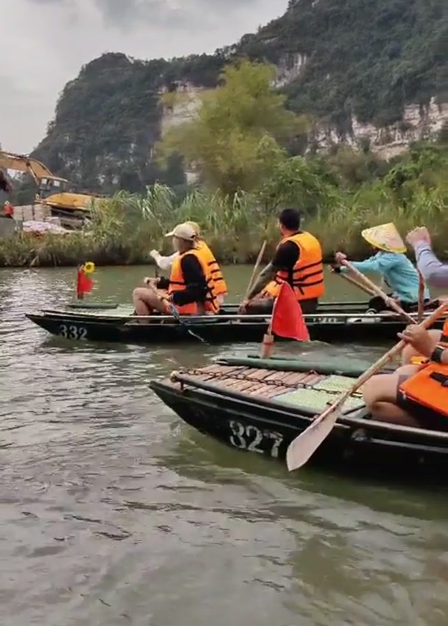 Several narrow boats are being rowed down a river. Each boat holds multiple passengers wearing orange life vests. The river is surrounded by green vegetation and mountains in the background. The sky is overcast. Some boats have small flags on them, and boat numbers are visible. Passengers are using oars to propel the boats. One person is wearing a conical Asian hat. An excavator is visible on the riverbank in the distance.