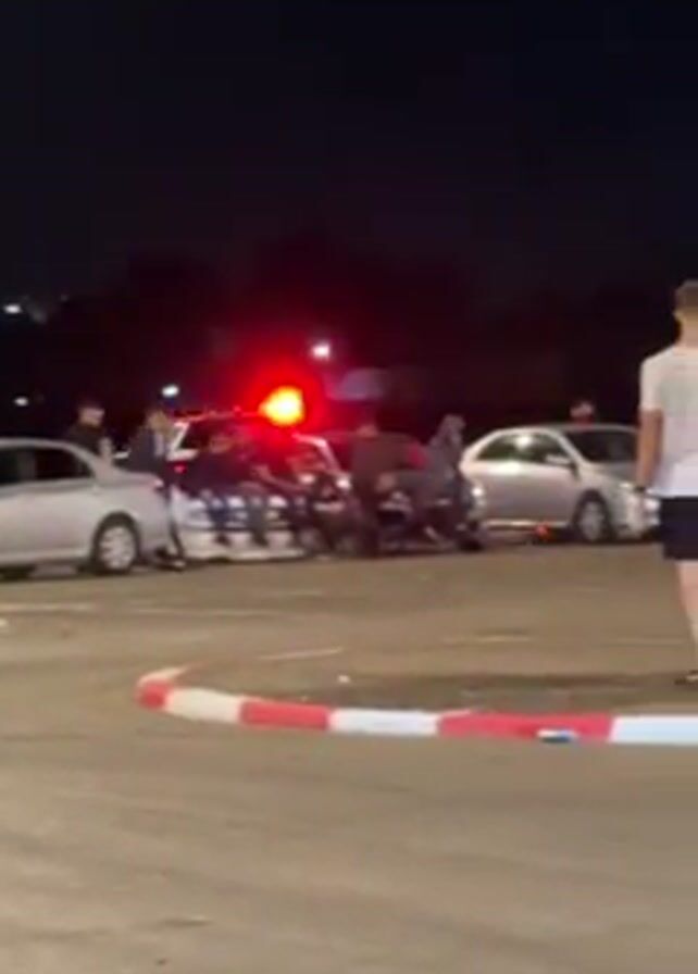 At night, a group of people are gathered in a parking lot with several cars. A police car is present with its lights flashing. Some people appear to be leaning against a vehicle while others stand around. One person wearing a white shirt and dark shorts raises their phone, seemingly taking a picture or video. The area is illuminated by streetlights and the flashing police car lights. There are road markings with red and white stripes visible on the ground. The surroundings appear to be urban or suburban.
