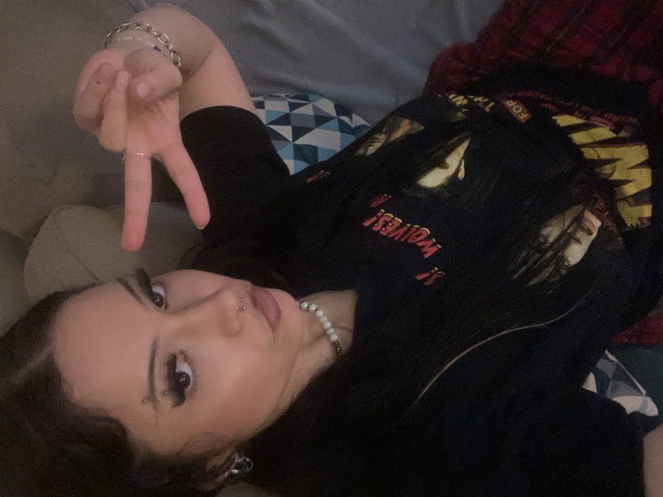An individual is depicted indoors, likely within a residence in Saint-Leu-la-Forêt, France. The subject, a female with dark hair, is positioned facing the camera with a slight head tilt. She wears a black t-shirt featuring a red "WOLVES!" graphic and other visual elements, including faces and partially visible text "FOR" on a yellow background. A red and black plaid garment or blanket is visible beneath the t-shirt. The individual's right hand is raised, forming a peace sign with the index and middle fingers extended. Facial features include dark eye makeup with elongated eyeliner and full lashes, defined eyebrows, and dark pink/plum-colored lips pursed into a pout. Piercings are present: a barbell in the left eyebrow, a septum ring, and potentially additional nose studs. Jewelry includes small silver-colored hoop earrings, a white beaded necklace (appearing as pearls), a silver-toned chain bracelet on the right wrist, and a thin silver-colored ring on the right middle finger. The background consists of indistinct, soft-surfaced furniture, including a light-colored surface behind the head and a geometric patterned pillow with blue, white, and dark triangular shapes visible on the right. The lighting is low to moderate.