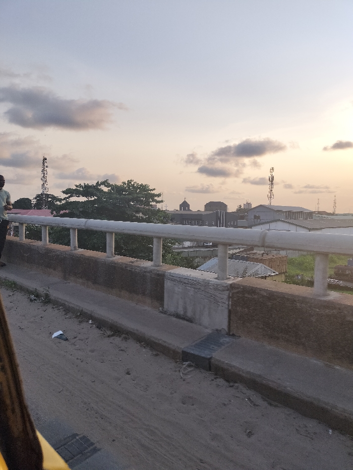A low-angle shot depicts a bridge with a concrete barrier topped by white railings. Beyond the barrier lies a cityscape with buildings, trees, and telecom towers under a cloudy sky at dusk. A pedestrian stands on the left side of the bridge. A discarded piece of white paper rests near the curb. The road surface is sandy and appears worn, suggesting a busy urban environment.