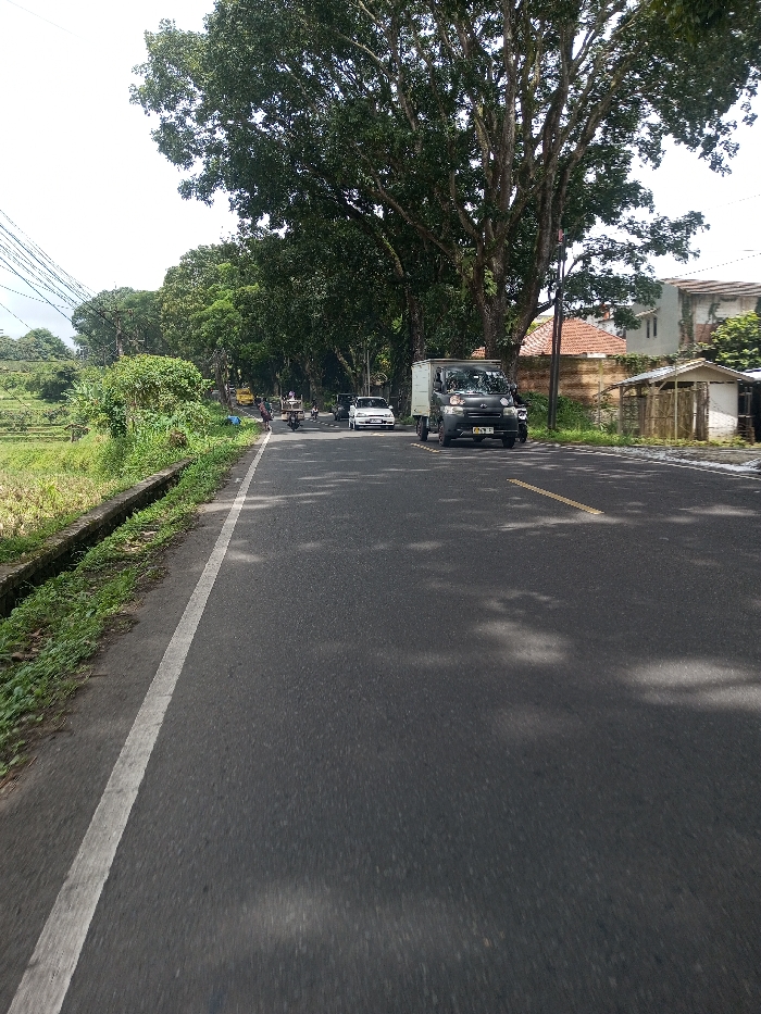 This image depicts a two-lane asphalt road in Khajuripada, India, under an overcast sky. The road features a solid white line on its left edge and a dashed yellow center line visible in the mid-ground. Shadows from overhead foliage are cast across the pavement. On the left side of the road, a concrete drainage ditch runs parallel to the asphalt. Beyond the ditch is an unkempt grassy verge, followed by an expanse of cultivated fields, likely rice paddies, extending into the distance. Utility lines are visible overhead on the left. On the right side of the road, large, mature trees with dense green foliage line the thoroughfare, their trunks forming a dense barrier. Behind these trees, a residential area is partially visible, including a building with a reddish-brown tiled roof, a light-colored wall, and a small, rustic wooden shed with a corrugated metal roof. Vehicular traffic is present on the road. In the foreground, traveling towards the viewer in the right lane, is a dark grey or black compact box truck with a license plate partially legible as "D...". Further down the road, in the left lane, a white sedan is moving away from the viewer. Behind the sedan, a dark motorcycle carrying one individual is visible, also traveling away. Additional indistinct vehicles and figures are present further down the road, with a yellow vehicle partially visible in the far distance on the left.