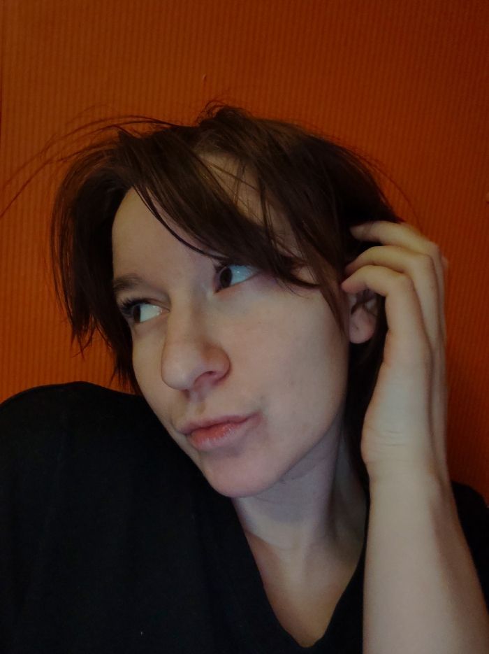 A close-up portrait depicts an individual positioned against a solid orange background featuring subtle vertical ridges. The subject has fair skin, short, dark brown, disheveled hair, and is wearing a black upper garment. The individual's head is tilted slightly downward and to their left (viewer's perspective), with their eyes gazing sharply towards their right (viewer's left). The right hand (viewer's left) is raised, with fingers making contact with the hair near the right temple and ear. The lips are lightly pursed. No other individuals or objects are visible in the frame. Location: Undetermined in the city of Unknown, Unknown.