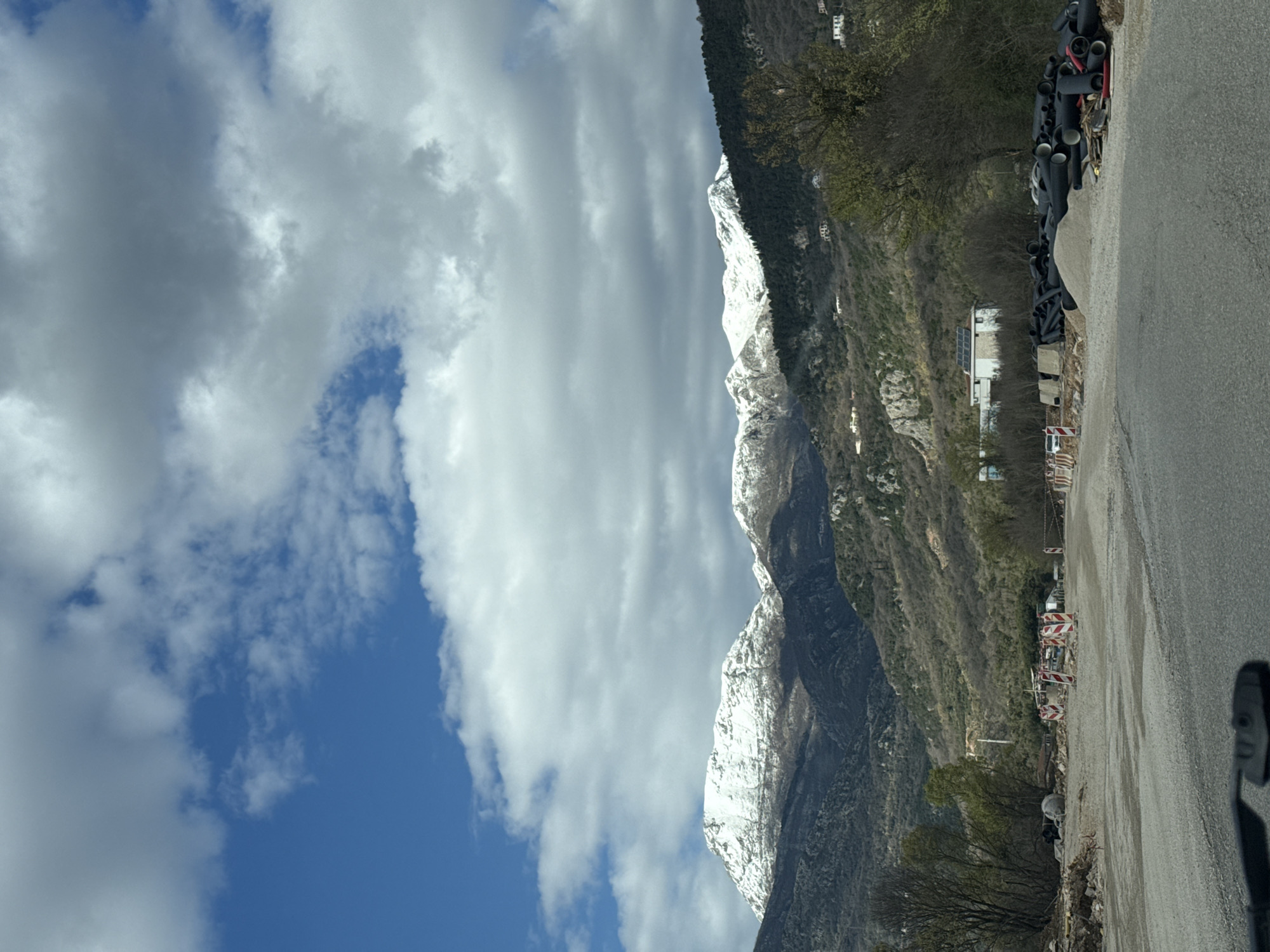 mountainous landscape with partially snow-covered peaks under a sky with scattered clouds. A road runs along the base of the mountain, with a pile of black pipes and other materials stored next to it. A white building is visible further up the slope. The location cannot be identified in the city of Prijevor, Montenegro.