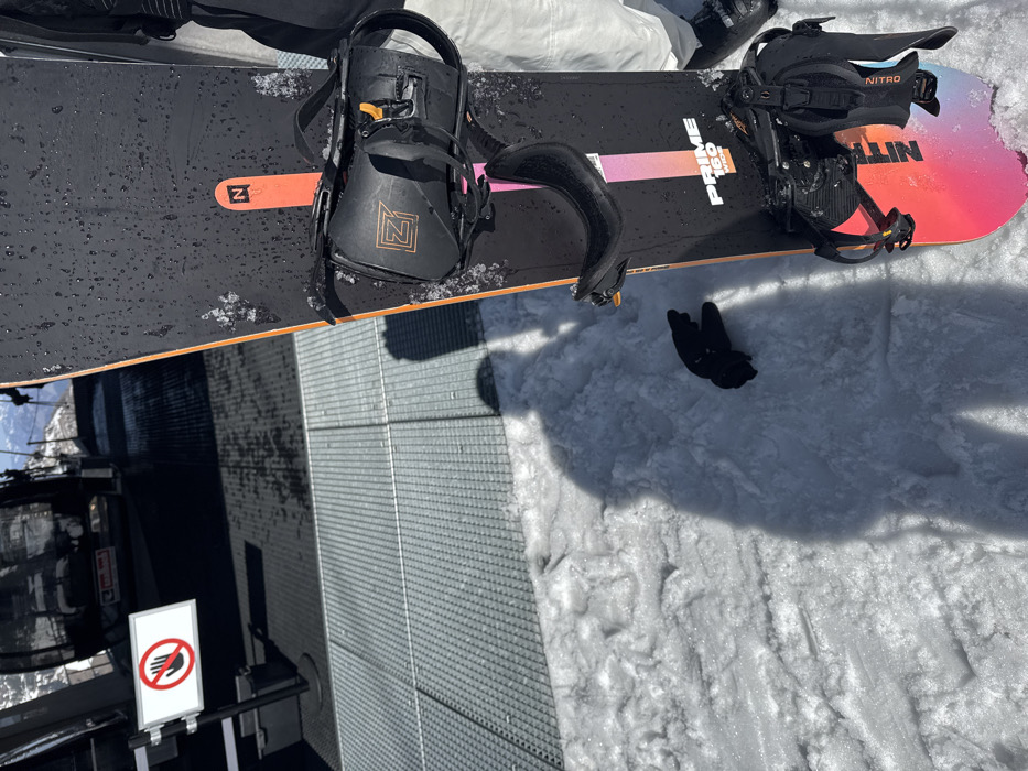 The scene depicts a snowboarder at a ski lift station in Saalbach-Hinterglemm, Austria, under clear, sunny conditions. A black snowboard, identified as a "NITRO PRIME 160 WIDE" with orange, pink, and white graphic accents, stands upright in the lower right, partially obscured by a person's lower body clad in white snow pants and a black boot. The snowboard is wet with visible water droplets and residual snow. Black bindings with yellow components are affixed to the board. In the lower left-midground, a black glove lies on packed snow. A prominent shadow of a person, extending from the lower-left, stretches across the snow and onto a dark grey metal grate surface that covers the central and upper-left ground. In the upper-left, a white rectangular warning sign with a red circle and a white outstretched hand symbol is visible. A dark ski lift gondola is partially visible behind the sign, with hints of snowy mountain peaks and a clear sky in the far background.