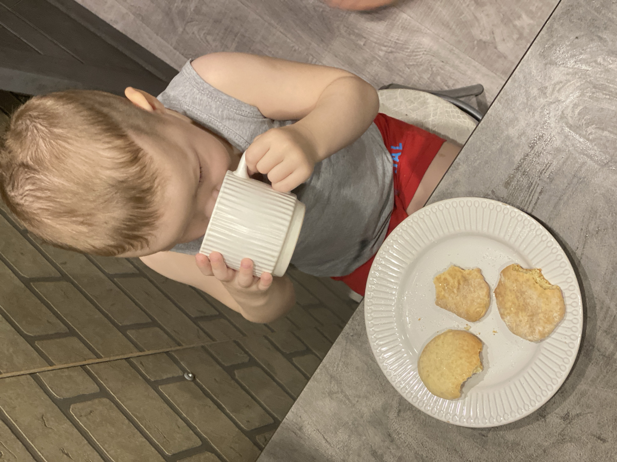 A young child with light brown hair, wearing a gray tank top and red shorts, drinks from a white ribbed mug. A white plate containing three partially eaten cookies sits on a gray countertop beside the child. The floor is tiled in a brick pattern. The location appears to be an indoor domestic setting, and there is no evidence to suggest the scene is in Sochi, Russia.