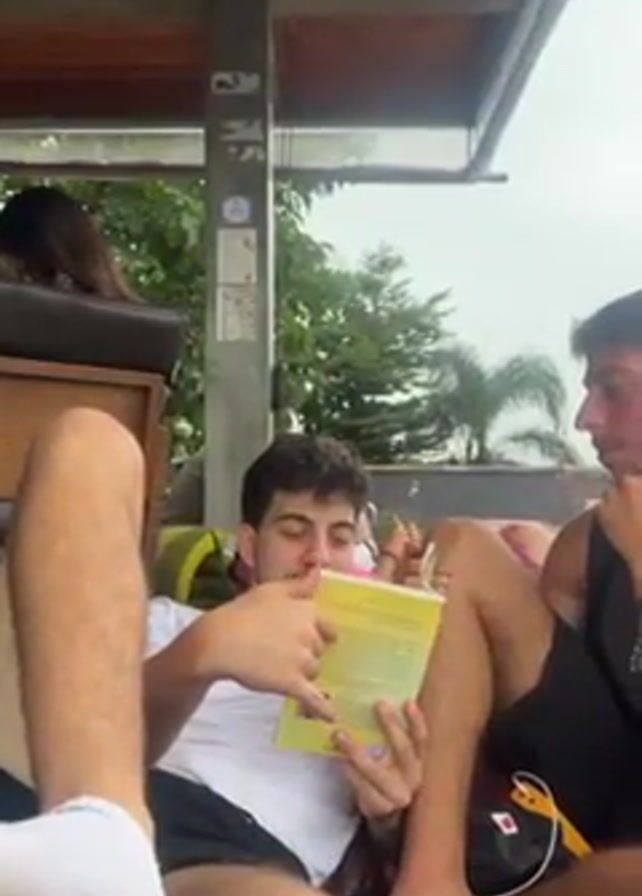 Two young men are relaxing on leather beanbag chairs on a covered balcony. The man on the left is wearing a white t-shirt and black shorts with a white sock on his left foot. He's holding a yellow book and pointing at a page, seemingly reading aloud to the other man. The man on the right is wearing a black tank top and black shorts. He has his right arm resting on his knee and his left hand on his chin, listening. A remote control sits near his leg on the beanbag. In the background is a woman with dark hair sitting in a chair and a lush green landscape under a cloudy sky. The balcony has a wooden roof and a metal railing.