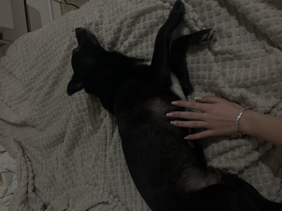 An indoor residential setting in the city of Unknown, Unknown, is depicted under low-light conditions. A black domestic dog with visible lighter fur on its underside lies on a light beige, textured waffle-weave blanket that covers a bed. The dog is positioned with its body extending from the lower left to the upper right, its head facing right with ears slightly erect and its right leg crossed over its left. A human left hand, featuring French-tipped manicured nails and wearing a silver-colored bracelet on the wrist, rests on the dog's mid-section. In the upper right background, a portion of a white furniture piece and a dark electrical cable on a light-colored floor are visible.