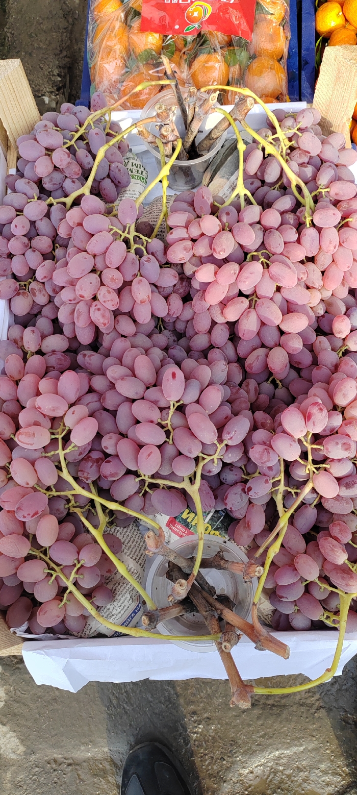 A close-up reveals a large quantity of pinkish-purple grapes packed in a white container. The grapes are arranged in bunches, their stems displaying a yellowish-green hue. Behind the grapes, a partially visible blue container holds oranges packaged in clear plastic. A small, transparent plastic cup holds grape stems. Below, a hint of a shoe and ground surface can be seen.