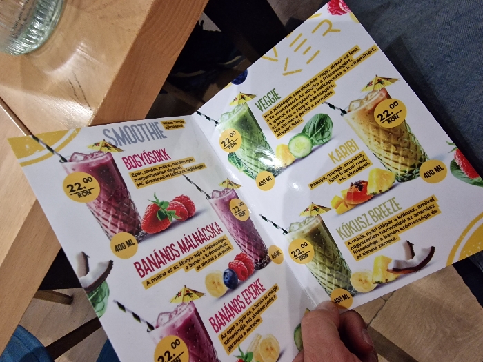 The scene depicts an indoor setting, likely a cafe or restaurant, in Odorheiu Secuiesc, Romania. A light-skinned hand with visible finger hair is holding open a folded, glossy, laminated menu on the lower left. The menu prominently features various smoothie options with their names in Hungarian, alongside colorful illustrations of the drinks and their ingredients, prices uniformly listed at "22 RON", and volumes specified as "400 ML". Visible smoothie titles include "BOGYÓSOKK" (Berries), "BANÁNOS MÁLNÁCSKA" (Banana Raspberry), "BANÁNOS EPERKE" (Banana Strawberry), "KOKUSZ BREEZE" (Coconut Breeze), "KARIBI" (Caribbean), and "VEGGIE". The ingredients depicted include strawberries, raspberries, blueberries, bananas, pineapple, coconut, papaya, mango, cucumber, and spinach. A light-colored wooden table with a visible grain occupies the right side of the frame. On this table, a clear, textured glass containing a transparent liquid is partially visible at the top right. Dark blue fabric, consistent with denim, is visible in the lower section of the image, presumably belonging to the person holding the menu.