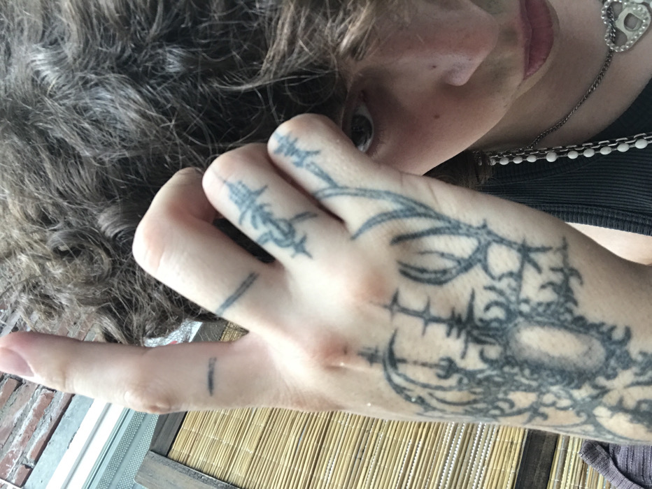 An individual with curly hair and light skin is depicted. The person is adorned with hand tattoos and a silver necklace. Focus is on the hand with intricate dark tattoos, extending from fingers to the back of the hand. The individual's eye and partial face are visible, suggesting a close-up shot. The background includes what appears to be brick and a woven surface.