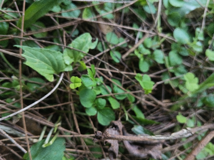 The image depicts a close-up, ground-level view of mixed vegetation and organic debris located in Munyati, Zimbabwe. The scene is dominated by a dense arrangement of natural elements. Green foliage includes multiple small, rounded leaves, larger elongated leaves with visible venation, and a distinct four-lobed green leaf resembling a clover, positioned near the center. Interspersed throughout and forming the base layer are numerous dry, slender, brown organic fragments, consistent with fallen twigs or pine needles. A thicker, gnarled brown twig or small branch is visible in the lower right quadrant. The lighting is natural and diffuse, casting no harsh shadows. No individuals, animals, or man-made objects are present, and no actions or interactions are depicted.