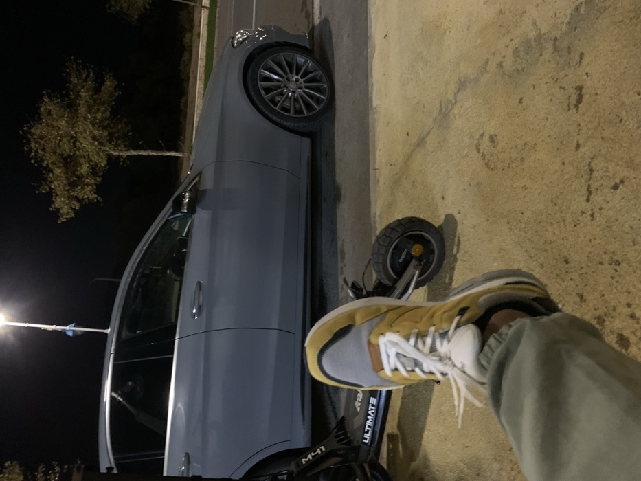This is a nighttime scene in M'diq, Morocco, illuminated by artificial light. In the foreground, the lower left leg of a person is visible, clad in light olive-green pants and a yellow, grey, and white athletic shoe with white laces. To the left and slightly behind the foot, a black electric scooter, marked "ULTIMATE," rests on the ground. Immediately behind these items, a dark grey sedan with tinted windows and multi-spoke alloy wheels is parked on the side of a paved road. In the background, a street light emits bright illumination, and a tree with sparse foliage is silhouetted against the dark sky. The ground in the immediate vicinity is light-colored, textured pavement, leading to a darker asphalt road surface.