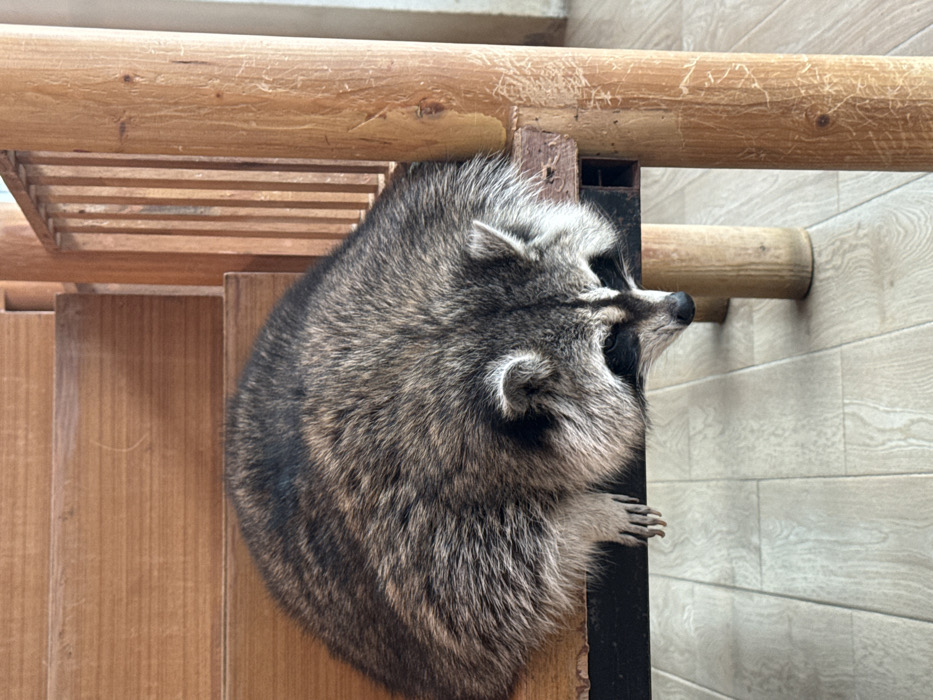 An adult raccoon is observed resting on a light-colored wooden multi-step structure, possibly a staircase or tiered platform, located indoors in Unknown, Unknown