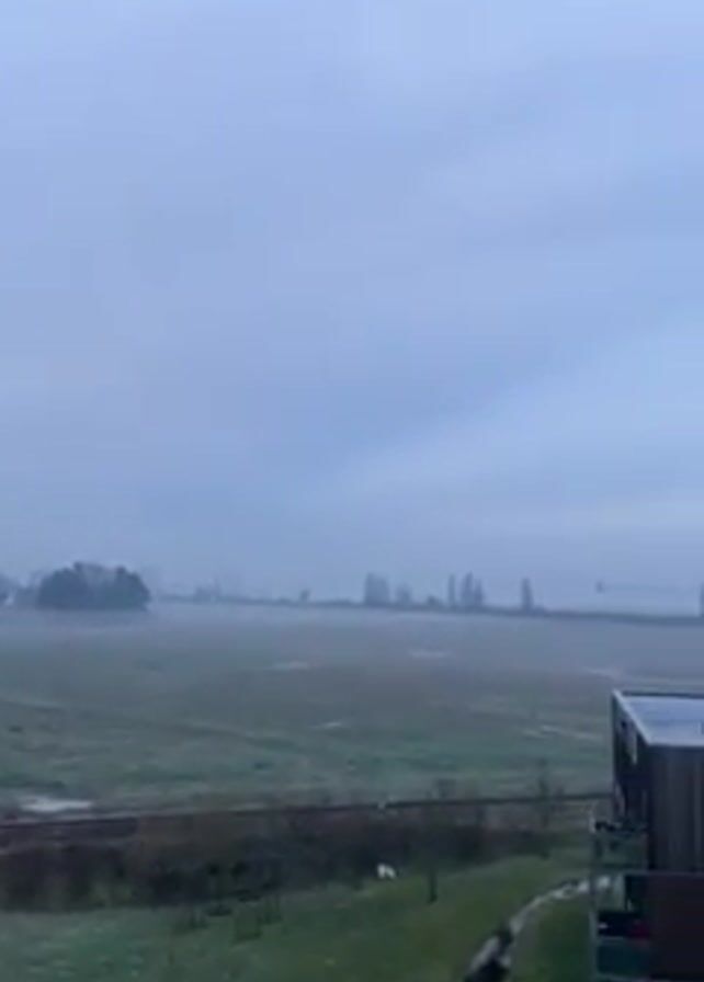 landscape on a foggy day. In the foreground, there is a green lawn and a glimpse of a building structure. Beyond that, a field is partially obscured by fog, with hints of vegetation visible. A dark line, possibly a road or track, cuts across the field. In the distance, faint silhouettes of trees and building structures are barely discernible through the fog. As the camera pans to the right, modern, multi-story buildings with brown and white paneling come into view, dominating the foreground. The sky is overcast, contributing to the muted, somber atmosphere.