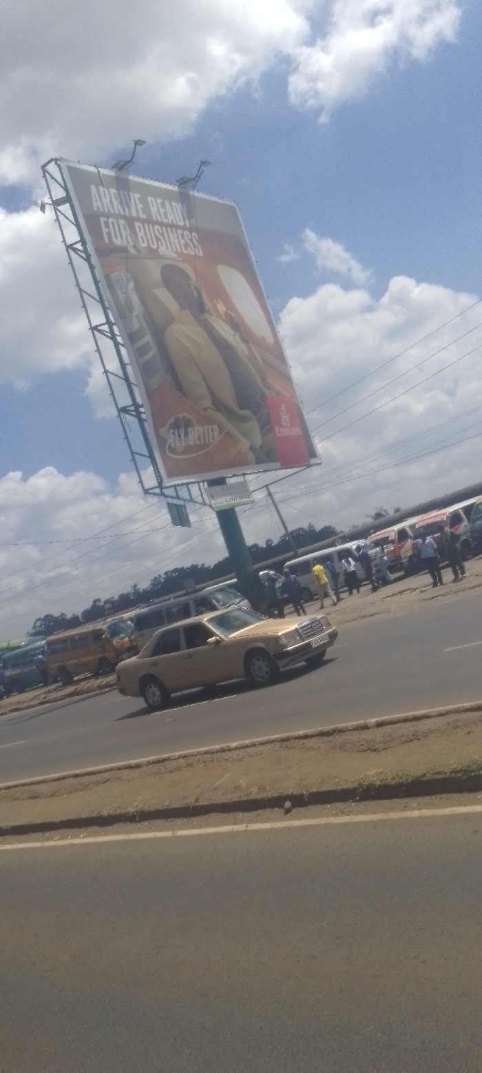 A billboard displaying an Emirates advertisement stands tall against a partly cloudy sky. The advert features a man inside an airplane, with the tagline "Arrive Ready For Business. Fly Better." Below, a gold Mercedes-Benz drives on an adjacent road. Multiple buses and vans park nearby, and several people stand around them, near roadside businesses.